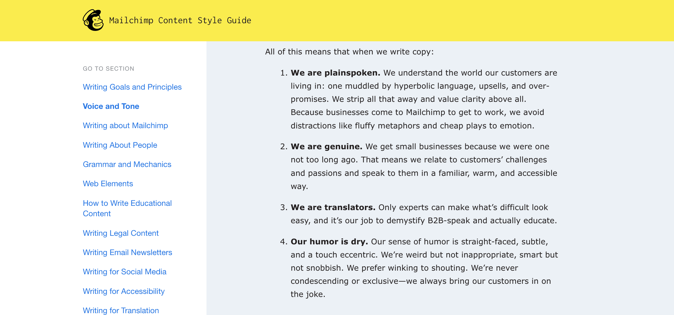 Screenshot from Mailchimp’s content style guide, outlining its distinctive brand voice and tone.